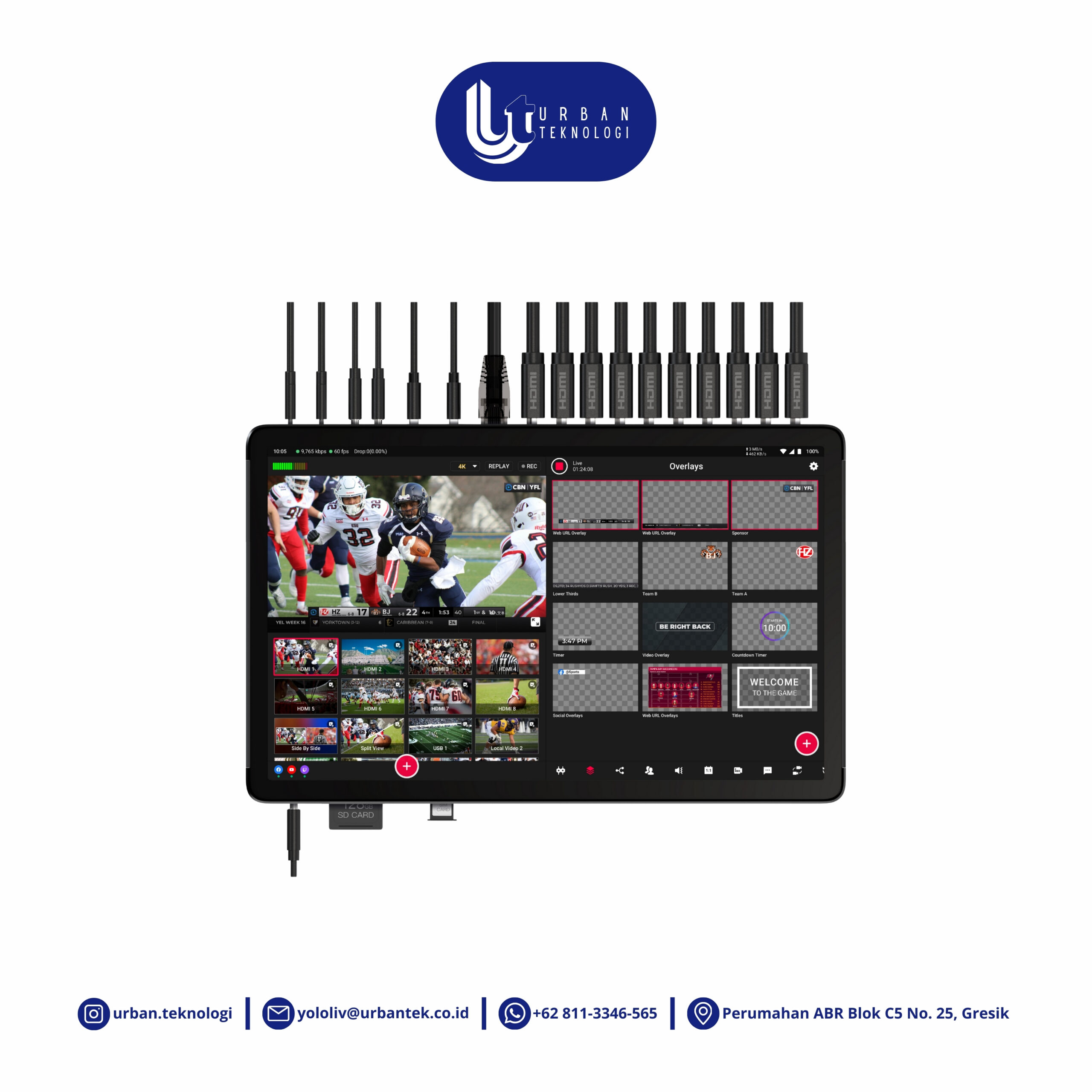 - x HDMI Outputs, Mic In, Line In, Audio Out1 x SD Card & 1xUSB Drive for Recording & Media Assets